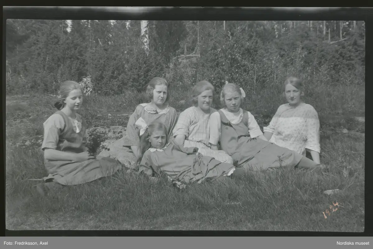 Sex unga kvinnor sitter utomhus i gräset.