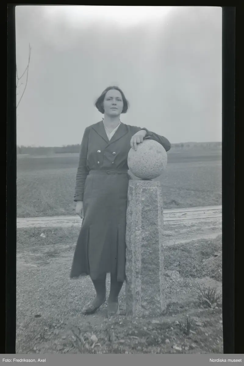 Titel: Porträtt av en kvinna som står lutad mot en grindstolpe i sten.