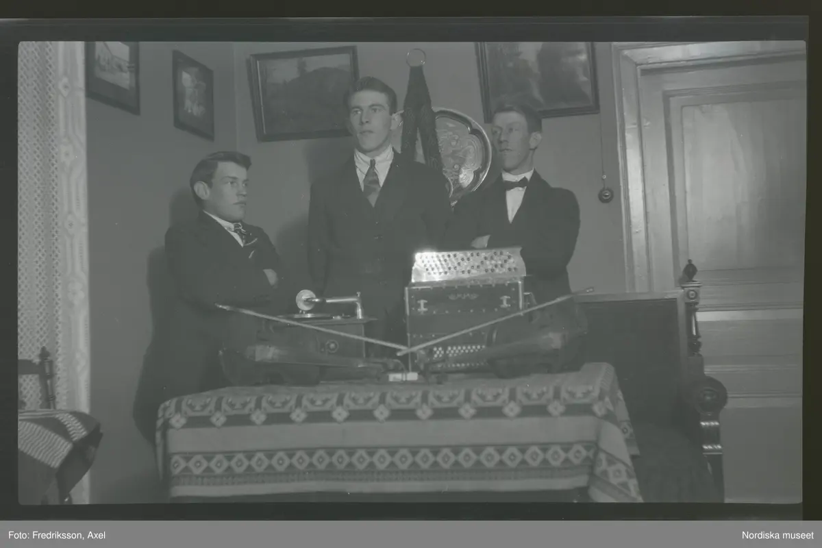 Albin, Gunnar och Johan Karlsson, Glimmersta. På bordet framför dem ligger instrument: dragspel och fioler.