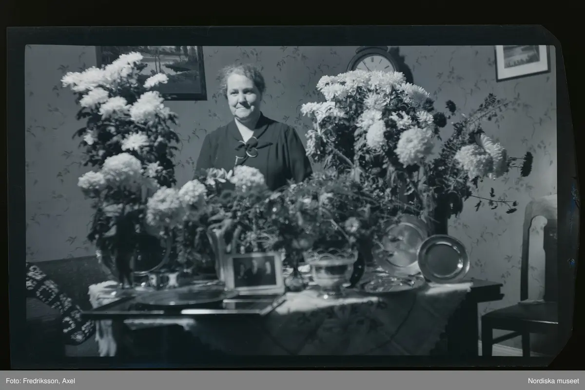 En kvinna står bakom ett bord med presenter och gratulations-blommor.