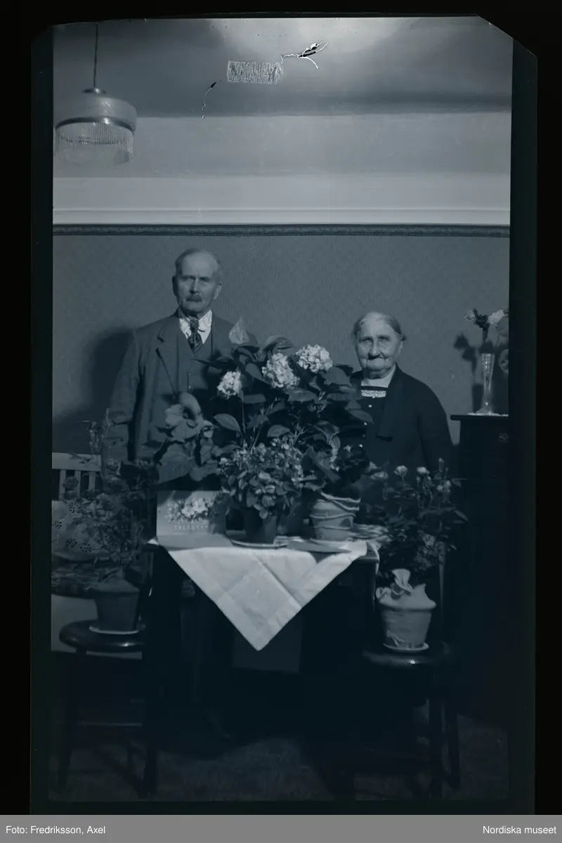 Fotografens föräldrar Fredrik Vilhelm Eriksson och Anna Maria står vid ett bord med gratulations-blommor.