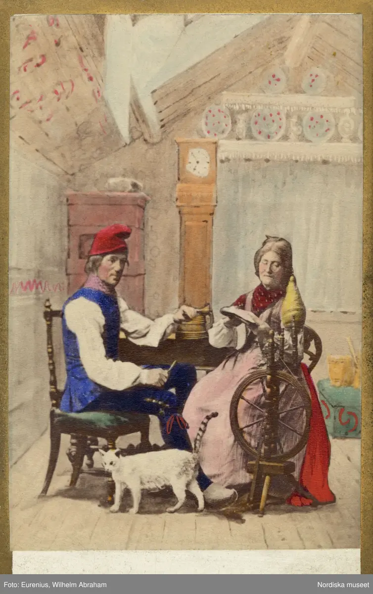 En man och kvinna sitter i ett kök, han snidar och hon spinner