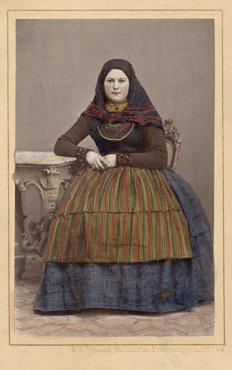 En kvinna i folkdräkt poserar sittande iklädd sjalett och randigt förkläde. Genarp, Skåne. Kolorerat i efterhand. Nordiska museet iv.nr. 18536C.