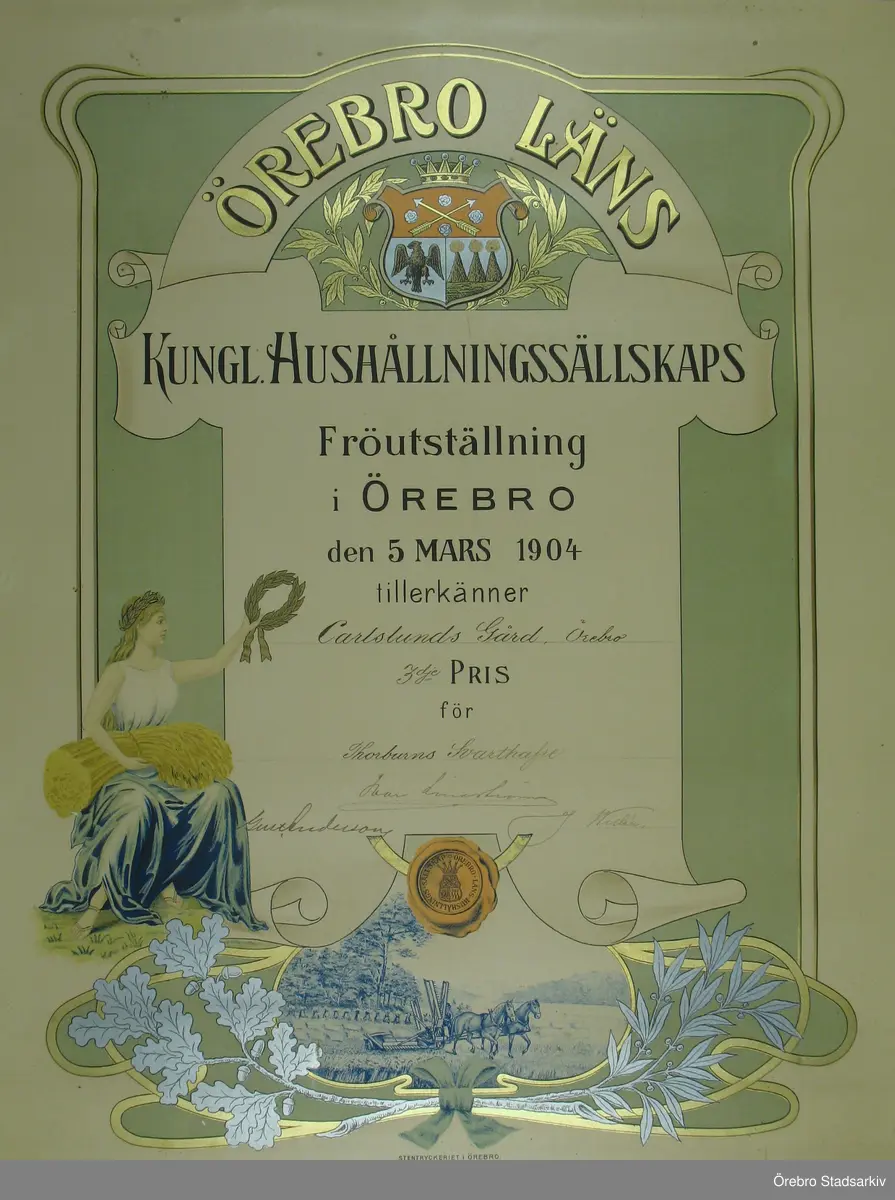 Diplom för Carlslunds gård för 3:e pris för Thorburns svarthavre, 1904-03-05