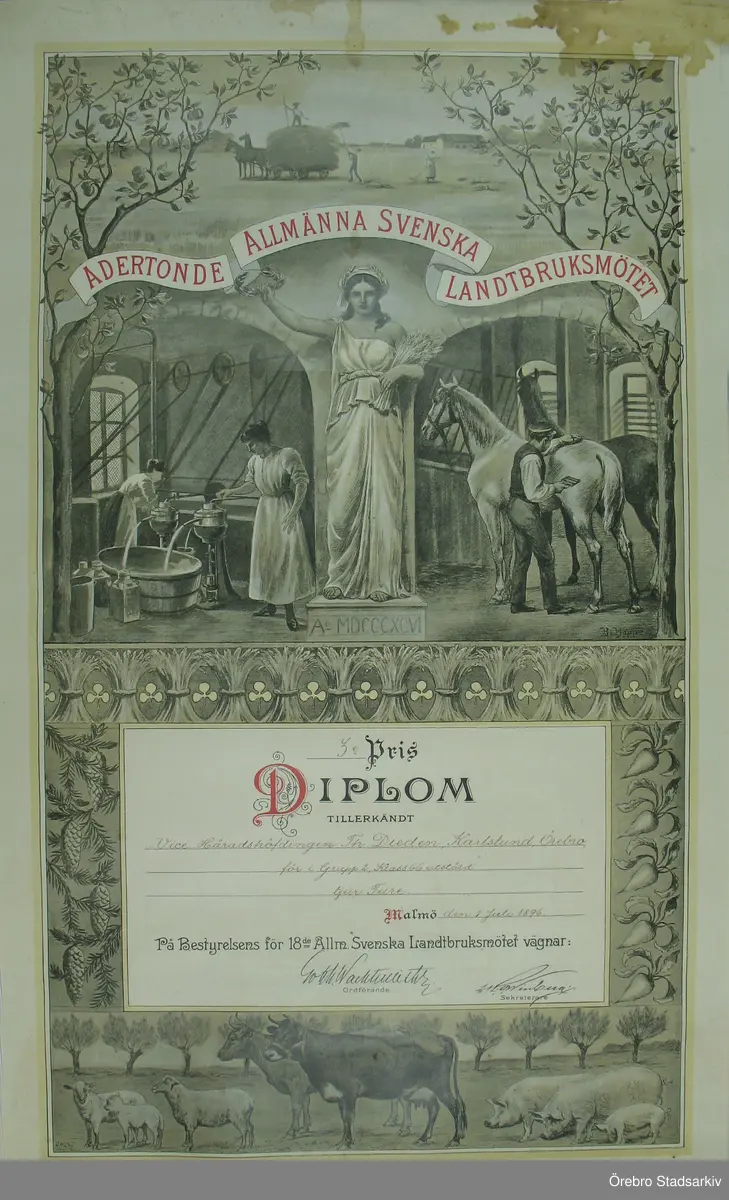 Diplom 3;e pris tillerkänt vice häradshövding Th Dieden på Karlslund för i grupp 2 avdelning 66 utställd tjur "Ture", 1896-07-01