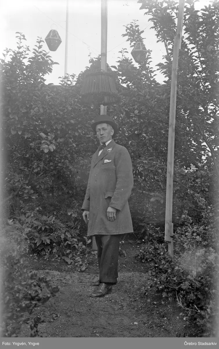 Man i hatt och överrock i park under fantasifull belysning, 1920-tal