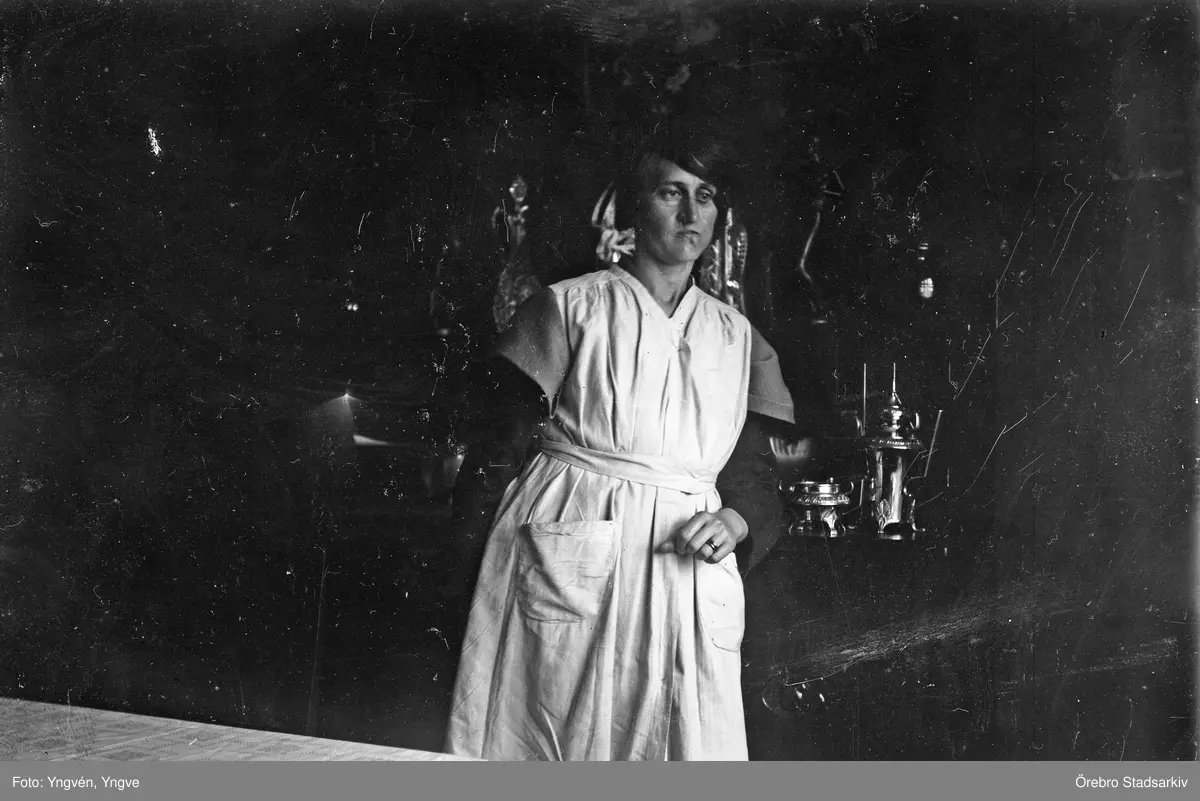 Kvinna i klänning och förkläde i mörkt rum, 1920-tal