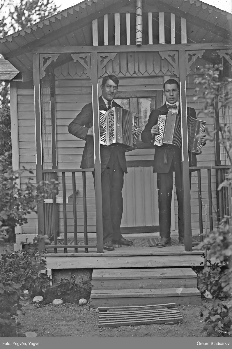 Två dragspelare i koloniområde i Örebro, 1920-tal