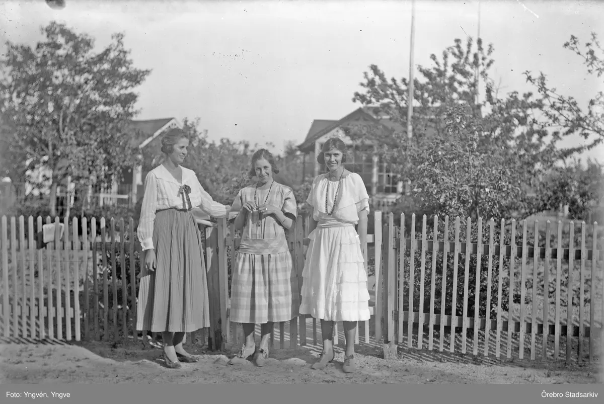 Tre damer vid staket till koloniområde i Örebro, 1920-tal
