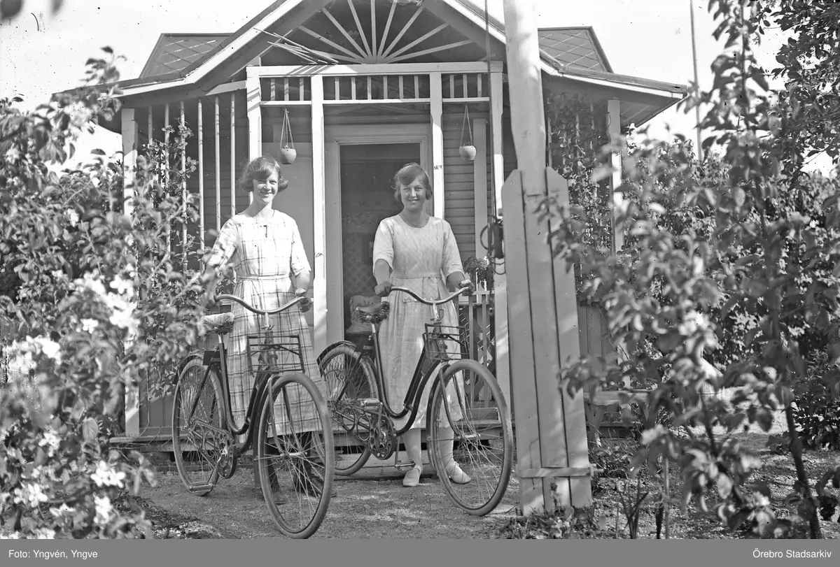 Två unga damer med cyklar vid kolonistuga i Örebro, 1920-tal