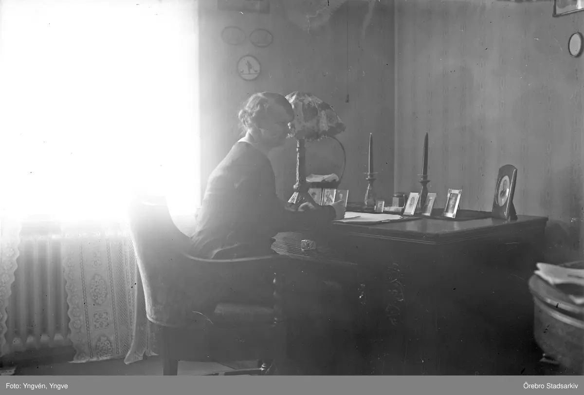 Kvinna skiver brev vid sitt skrivbord, 1920-tal