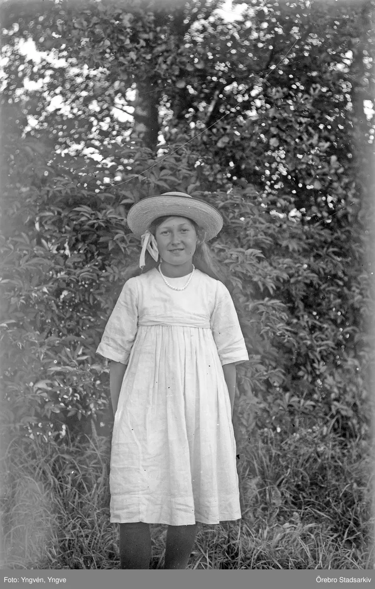 Ung kvinna i klänning och halmhatt i trädgård, 1920-tal