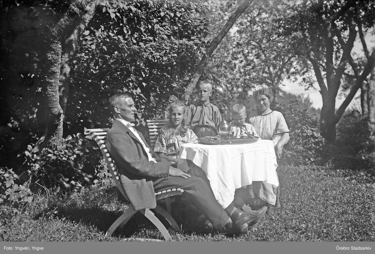Familj vid ett dukat kaffebord i trädgården, 1920-tal