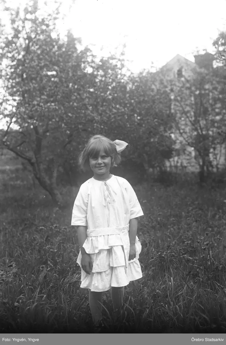 Porträtt av liten flicka i vit klänning och hårrosett i trädgård, 1920-tal