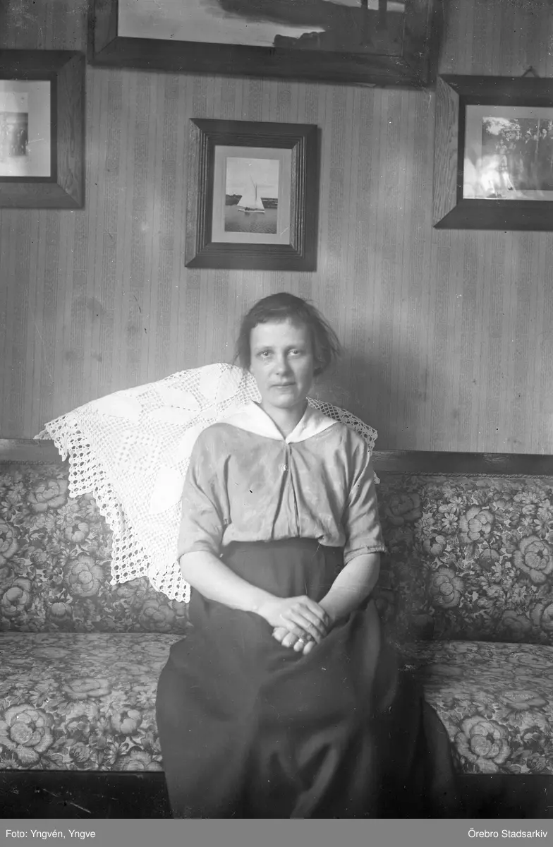 Porträtt av kvinna i soffa i hemmet, 1920-tal