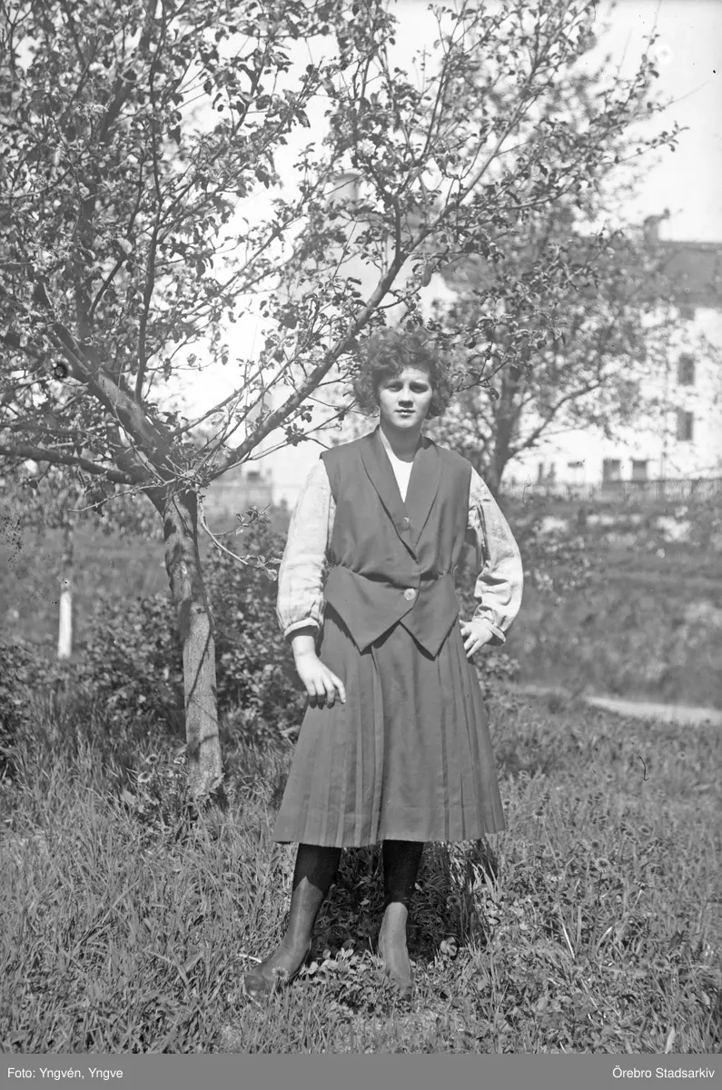 Kvinna i kjol och väst ute i trädgården, 1920-tal