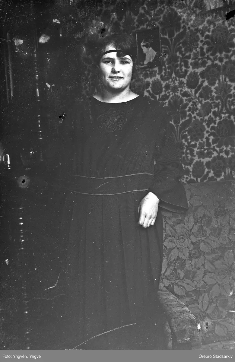 Kvinna i mörk klänning och pannband, 1920-tal