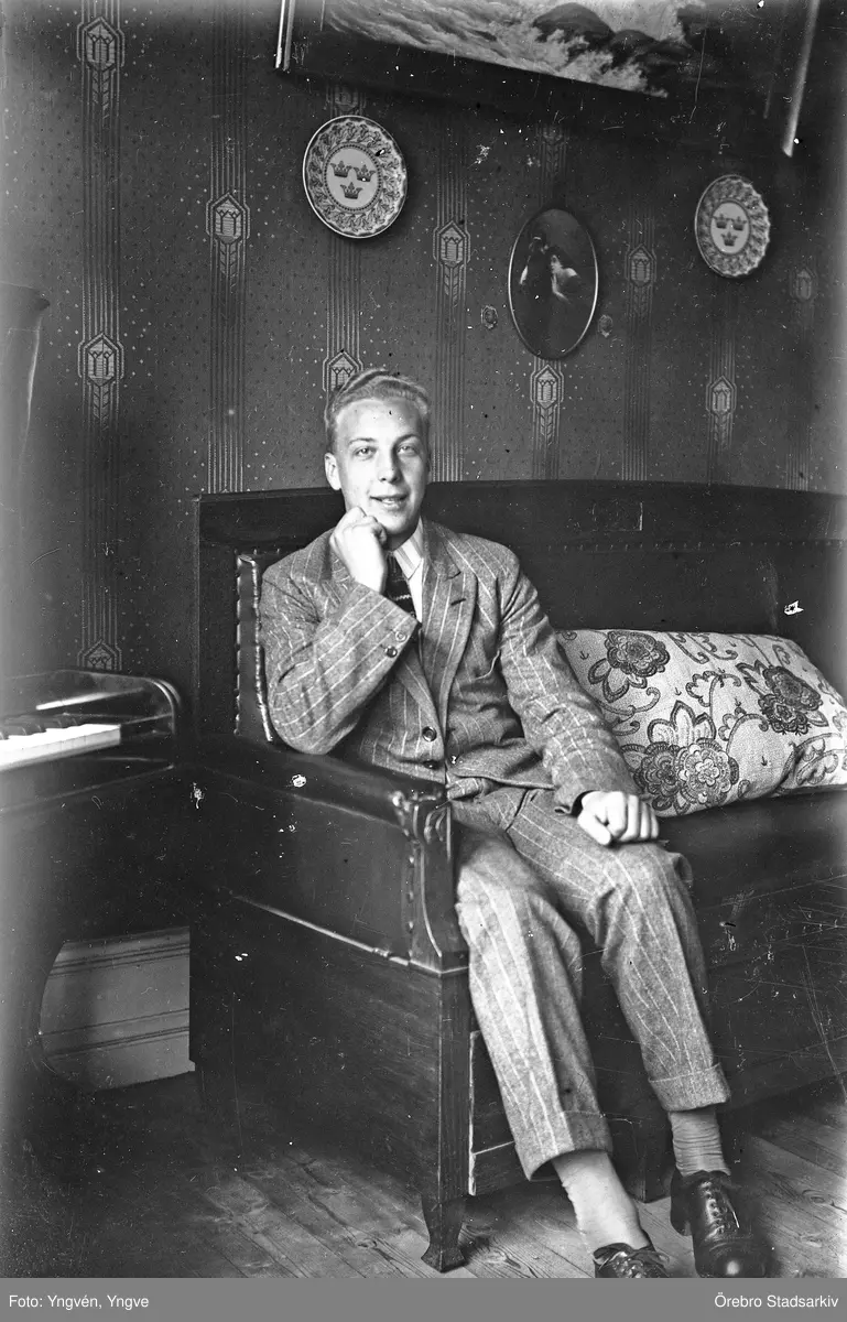Ung man i randig kostym sittande i soffa, 1920-tal