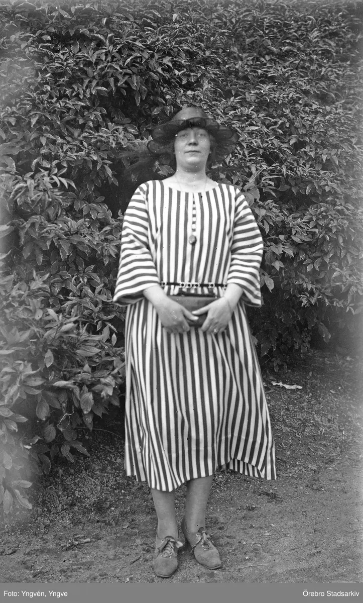 Kvinna med randig klänning med hatt och handväska i trädgård, 1920-tal