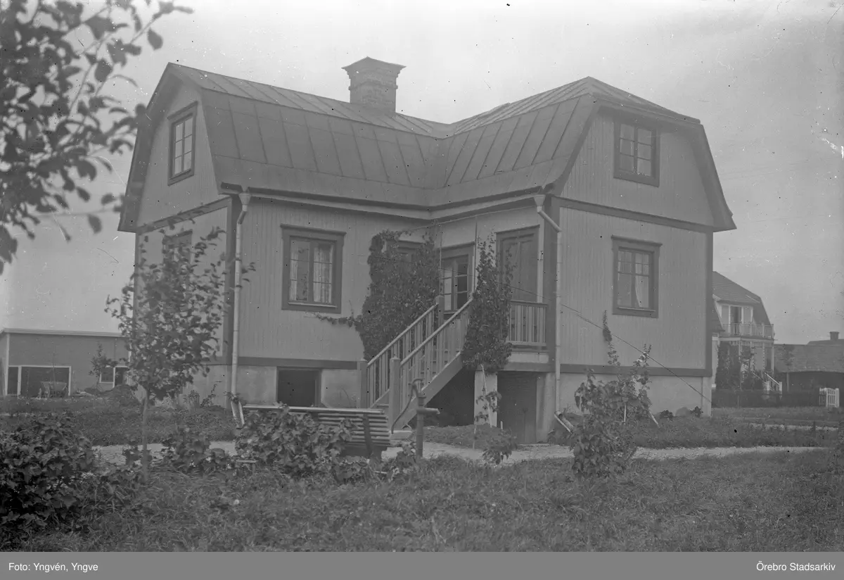En parkbänk och en vattenpump i trädgården vid trähus i Örebro, 1920-tal