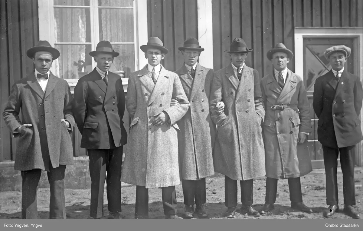 Sju herrar i hatt och ytterrock står i rad framför trähus, 1920-tal
