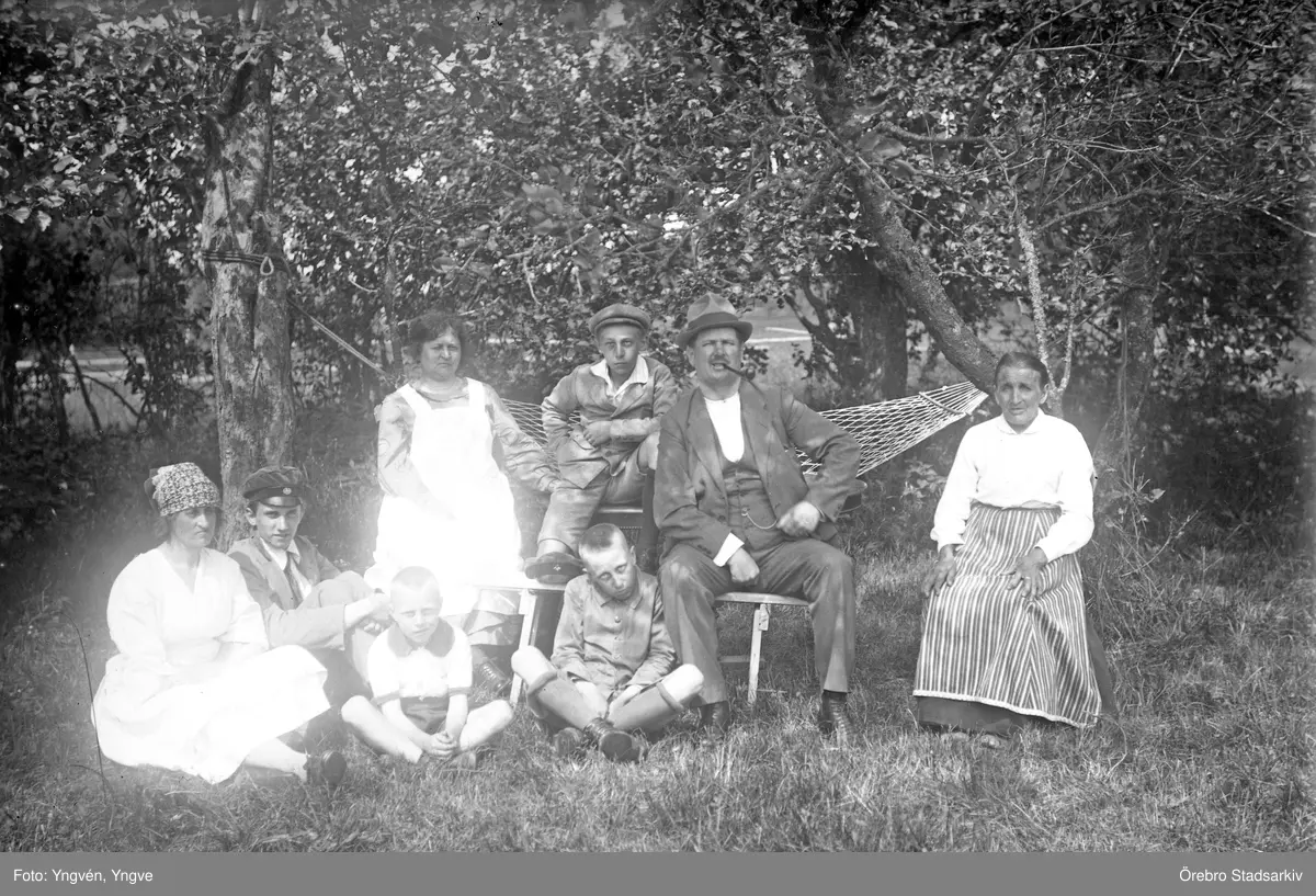 Familjen poserar vid hängmattan framför kameran, 1920-tal