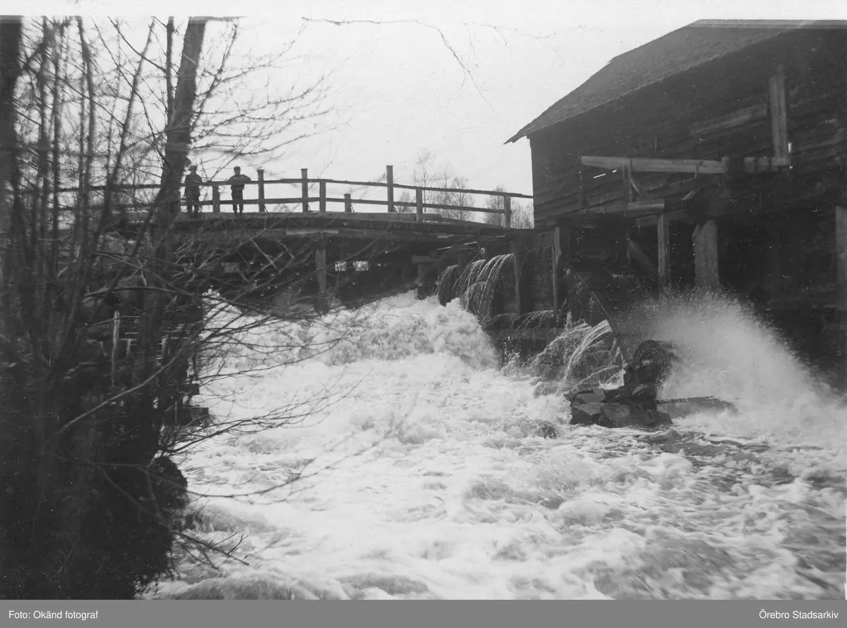 Pojkar står på bron ovanför Axbergshammars kvarn, 1910