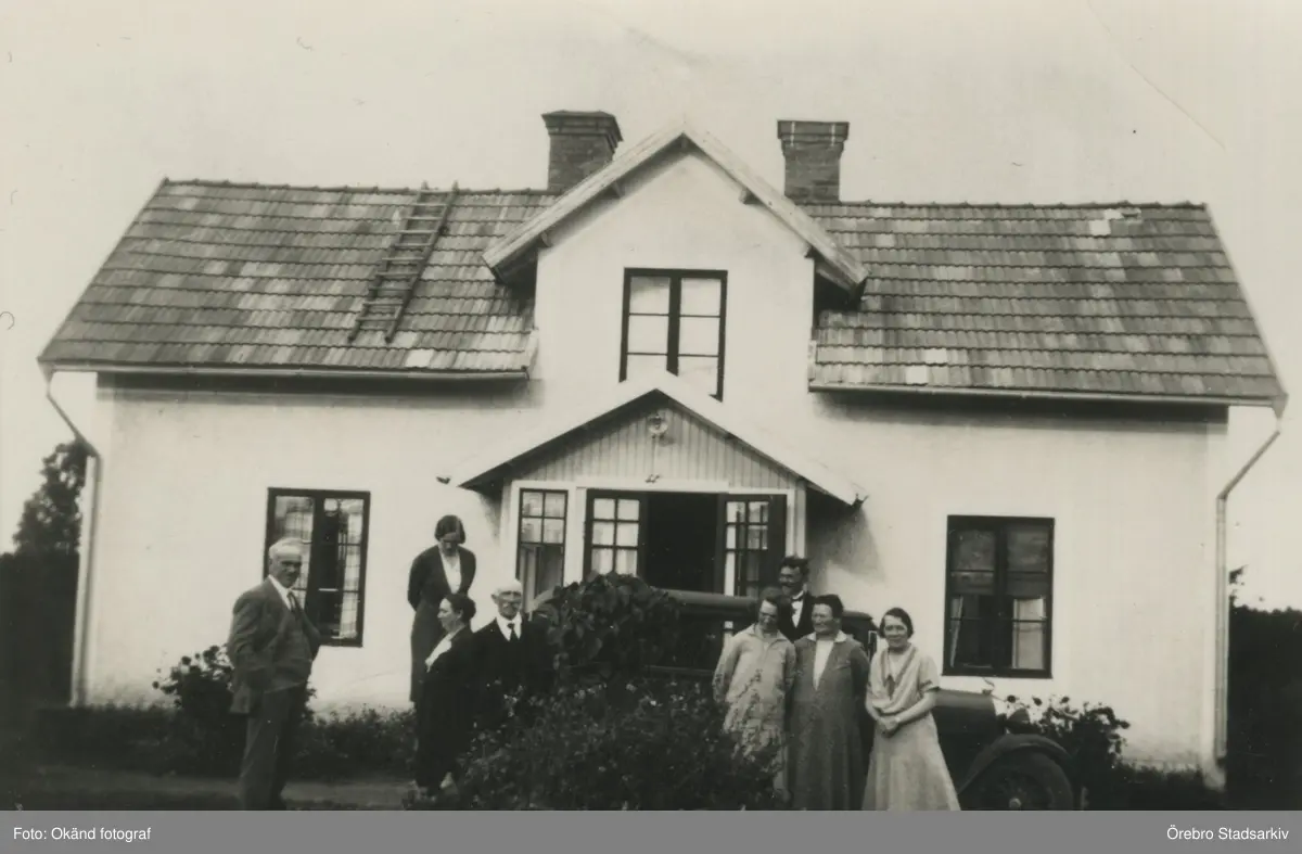 Familjen samlad runt gästernas bil som är parkerad vid Stenhammar i Lillkyrka, 1940-tal