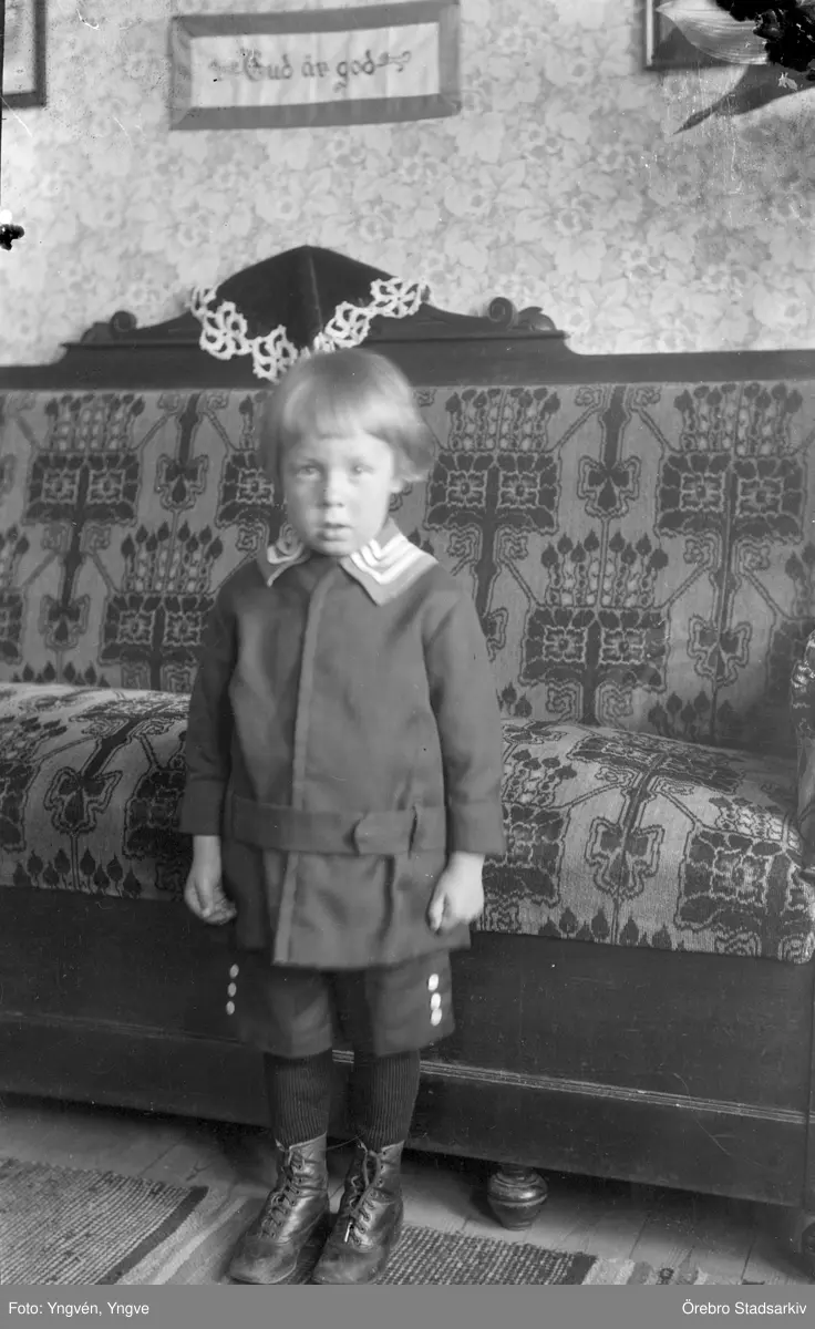 Gosse i kostym framför soffa, 1920-tal