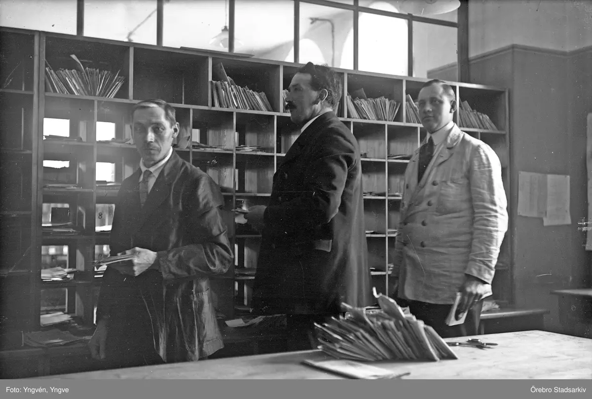 Tre män fördelar posten på Post- och telegrafstationen i Örebro, 1920-tal