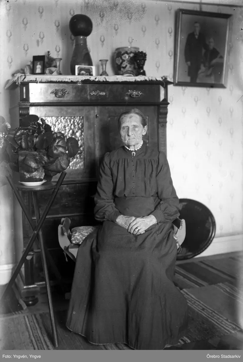 Äldre kvinna sittande på pianopall framför byrå, 1920-tal