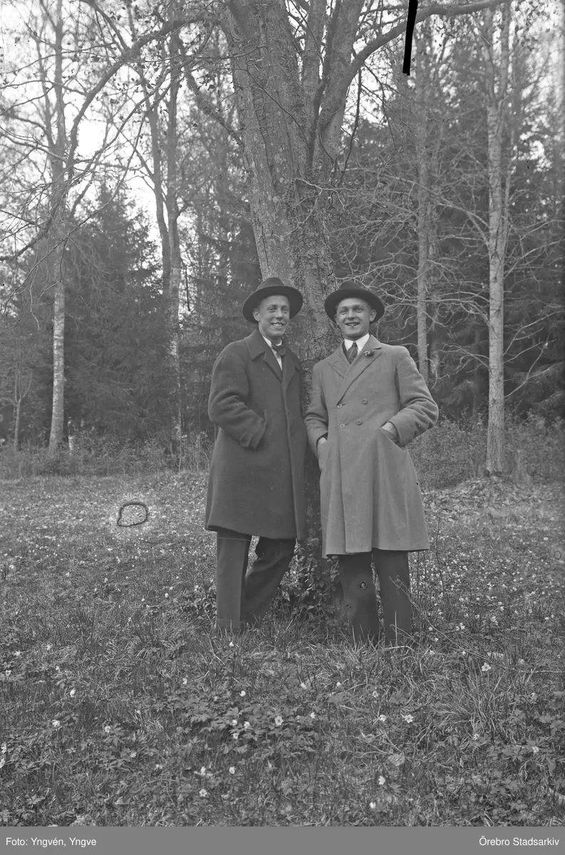 Två herrar i kostym, överrock och hatt lutar sig mot ett träd i skogen, 1920-tal