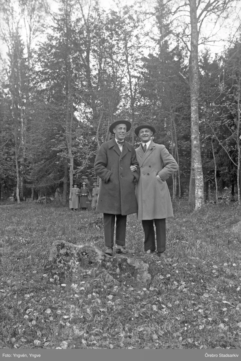 Två uppklädda herrar nära kameran medan tre kvinnor står bakom, 1920-tal