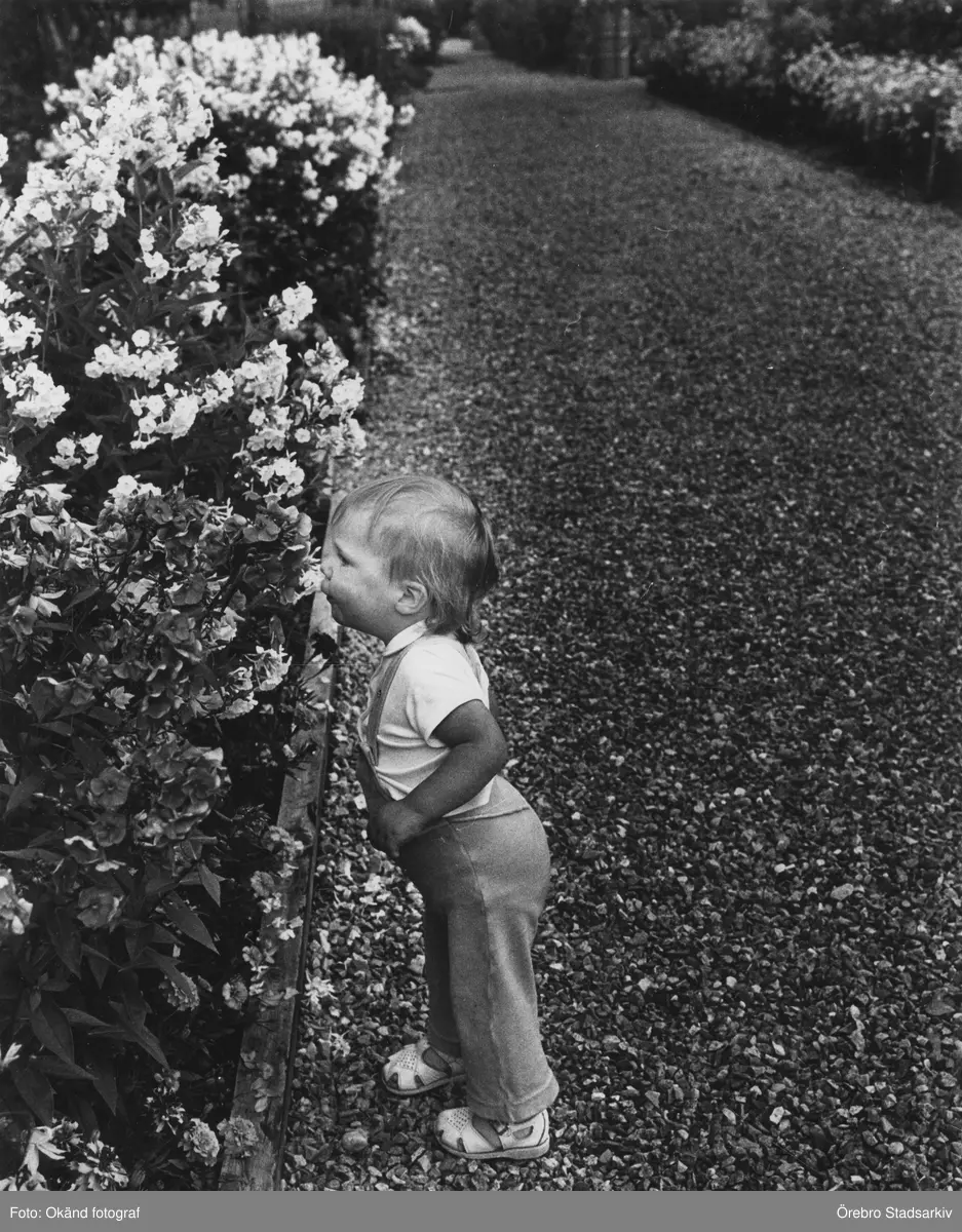 Barn luktar på blommorna vid Centralverkstädernas kolonistugeområde, 1960-tal