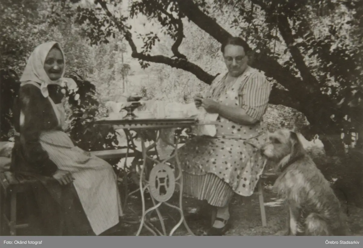 Maria stickar och moderna Tilda väntar på sitt kaffe i trädgården i Lillkyrka, omkring 1920