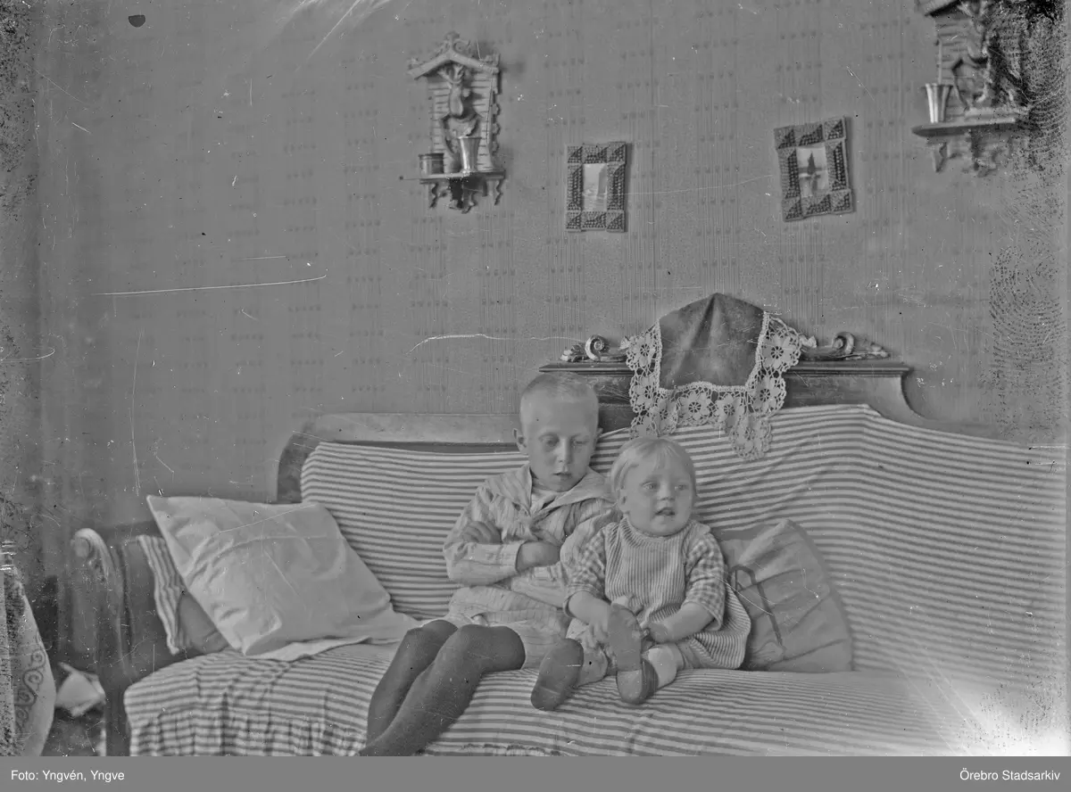 Pojke i randig sjömanskostym och flicka i rutig klänning med randigt förkläde i soffa med randigt överdrag i hemmet, 1920-tal