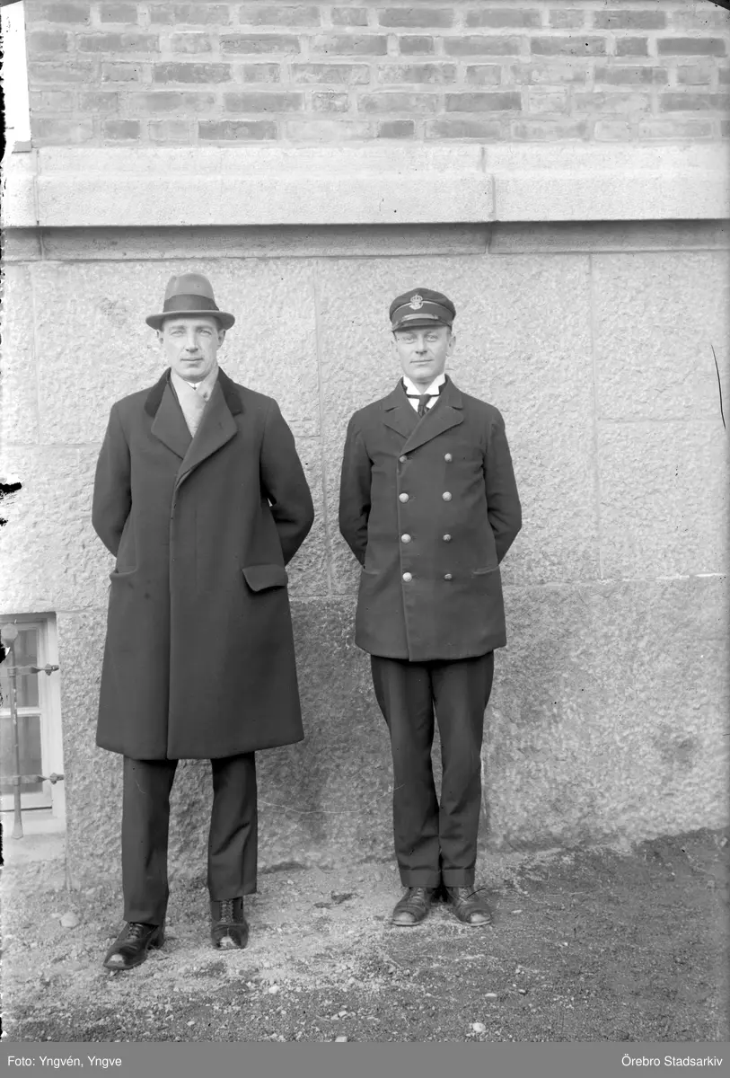 Två män utanför post- och telegrafstationen i örebro, 1920-tal