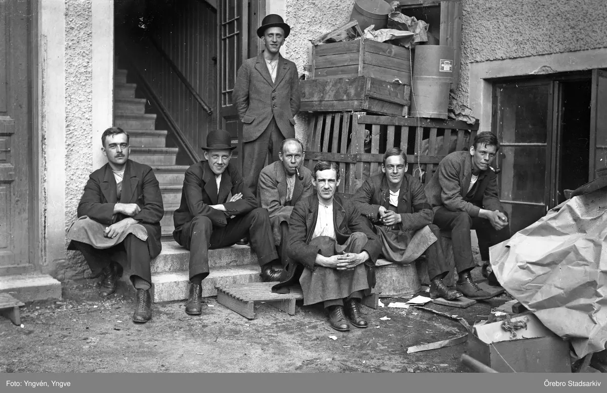 Anställda vid AB Lindberg strå- och filthattfabrik tar en paus i arbetet, 1910-tal