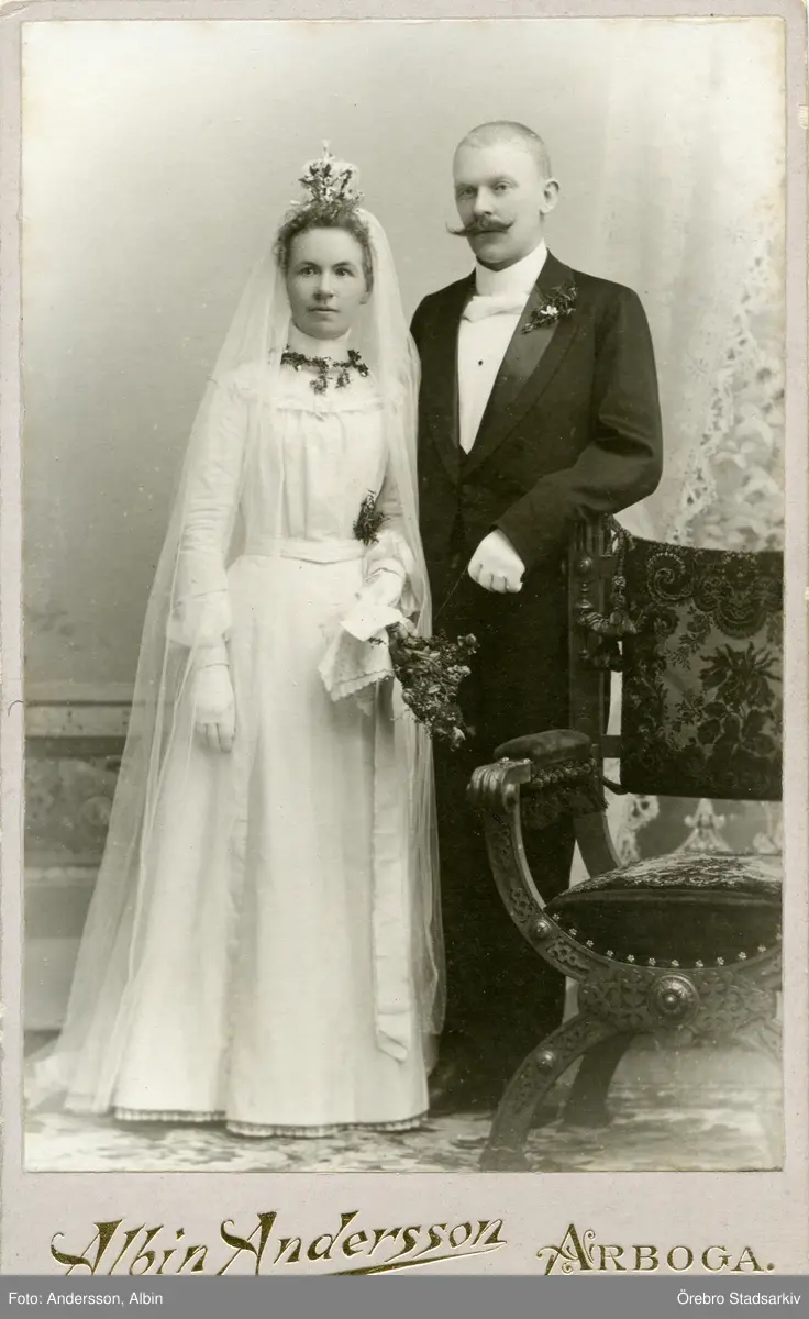 Brud i vit klänning, vita handskar och myrtenkrona bredvid sin brudgum i Arboga, omkring 1900