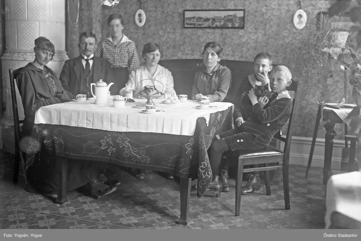 Familj sitter runt bord dukat för kaffe, bullar och kakor, 1920-tal