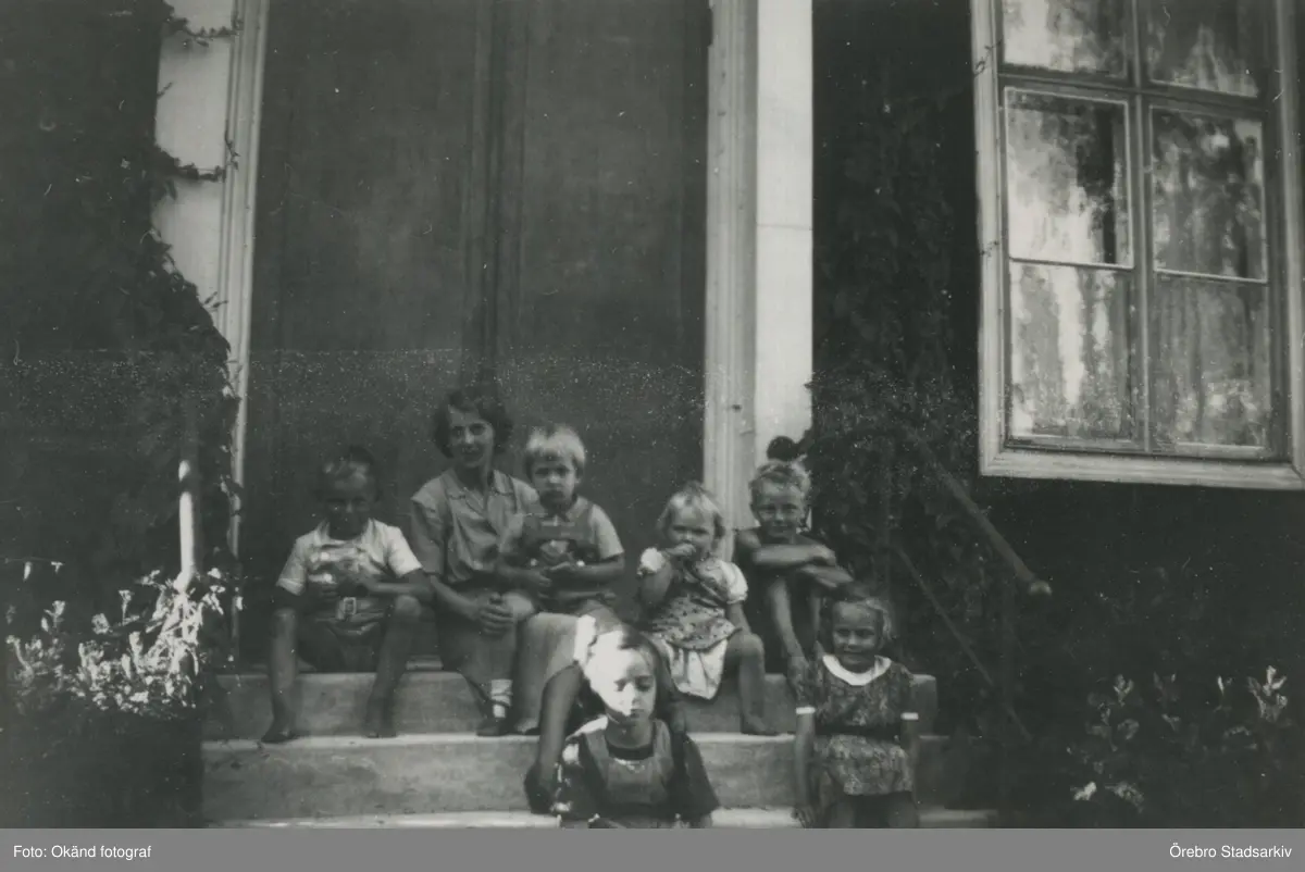 Astrid sitter på trappan till missionshuset i Mäjsta i Ringkarleby tillsammans med flera barn, 1940-tal