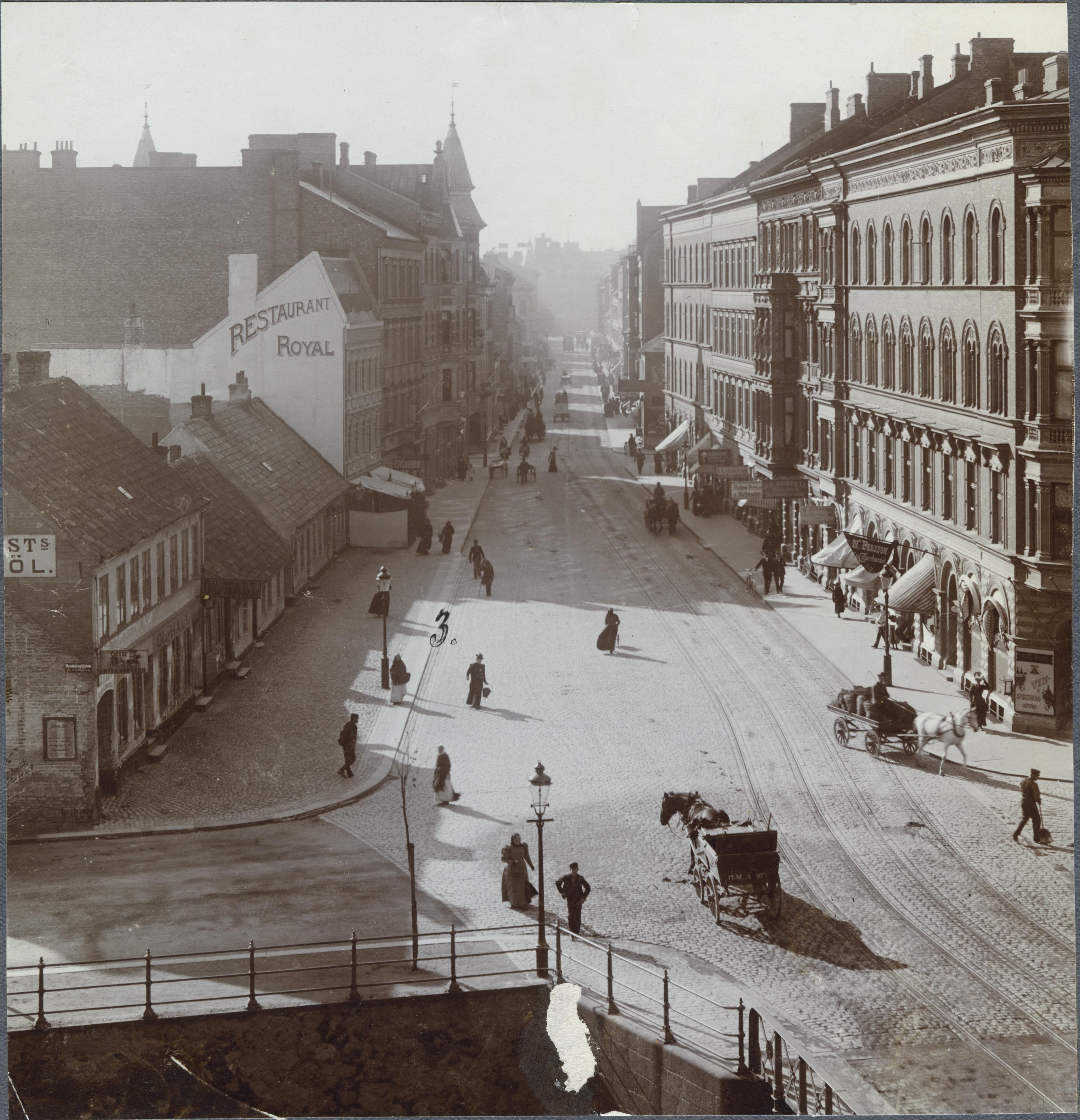 Södra Förstadsgatan, sedd från Södertull. Restaurang Royal till vänster i bilden flyttade till Södra Förstadsgatan 1902.
