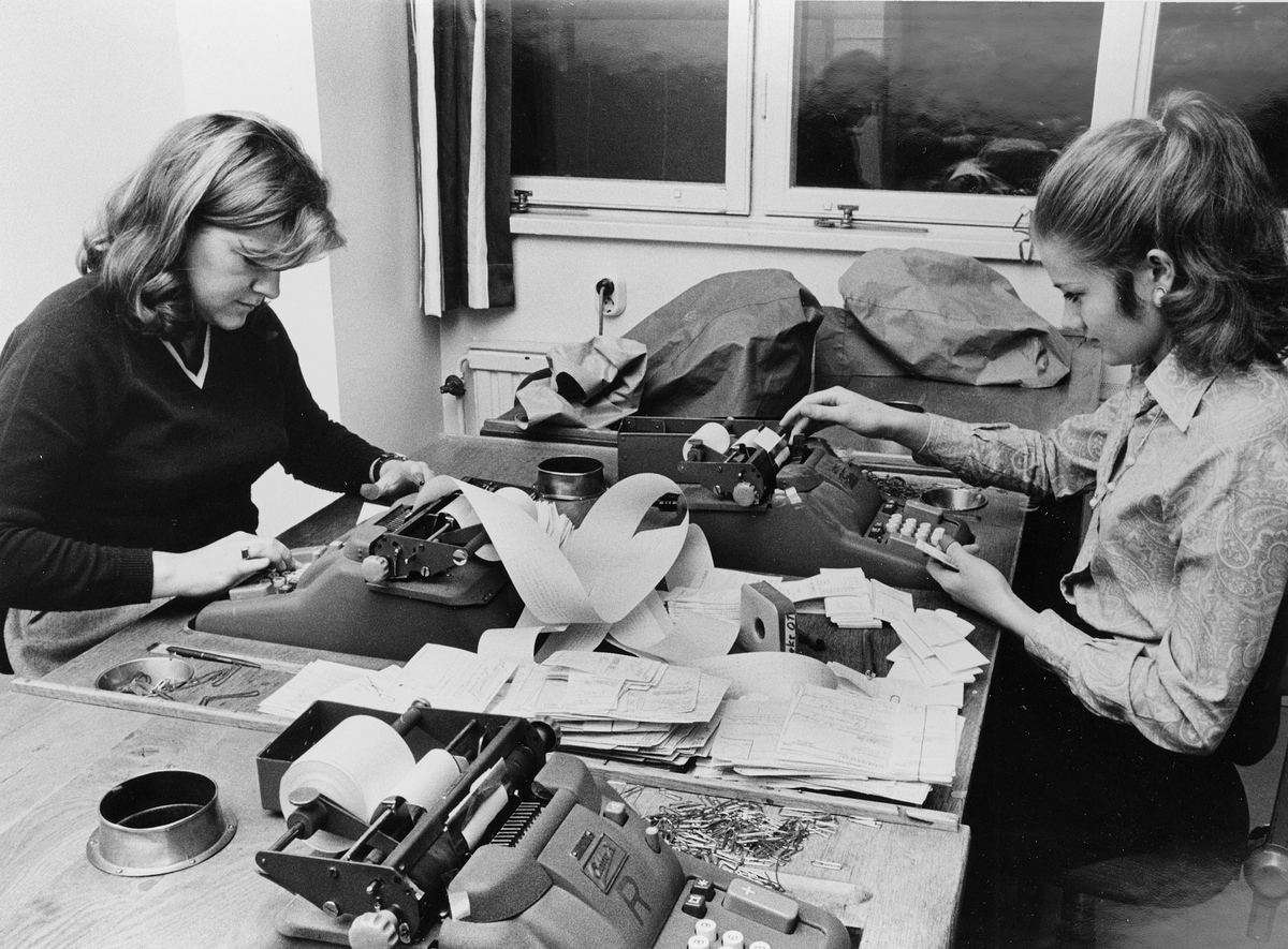 arbetar flickor med adderingsmaskiner.