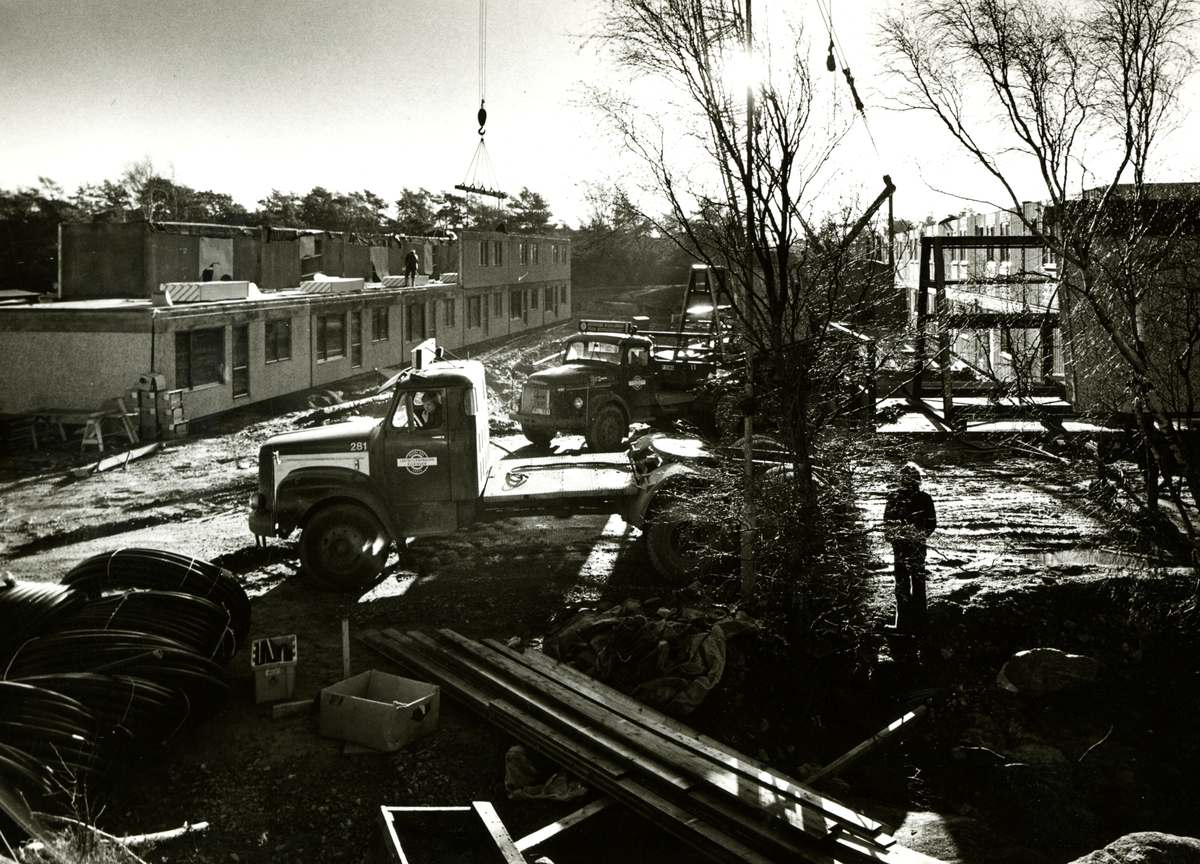 Titel: Korsåsen Korsåsgatan Korsåsliden Radhus uppförda 1973-74 Bostadsaktiebolaget lät sin elementfabrik producera betongelement till radhusen på Korsåsen som ett experiment. Korsåsen blev det enda området av sitt slag som byggdes på det här viset, trots att husen ansågs vara både prisvärda och med hög trivsel.