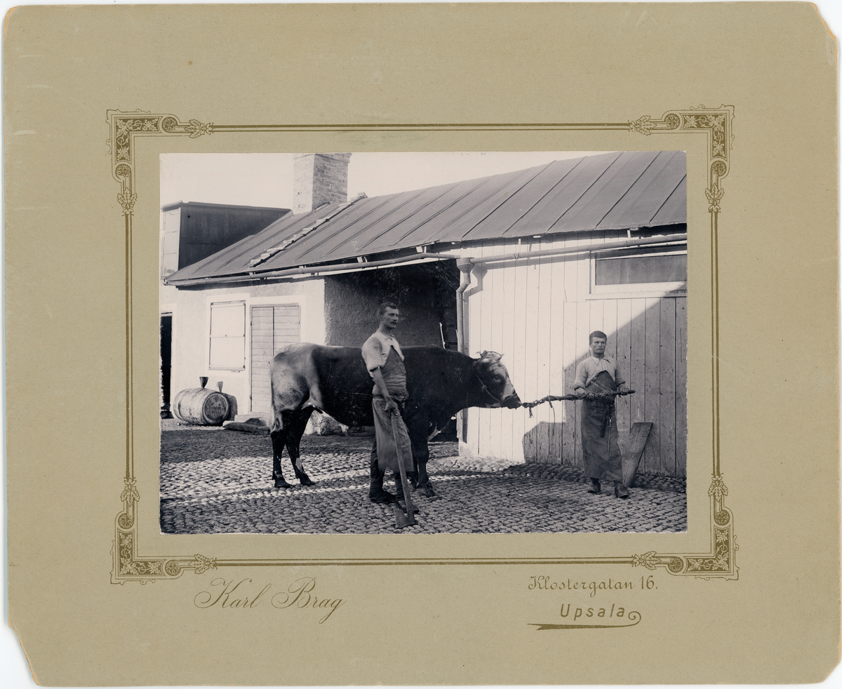 Slaktare Andersson och Gustav Löfgren med en tjur, Uppsala