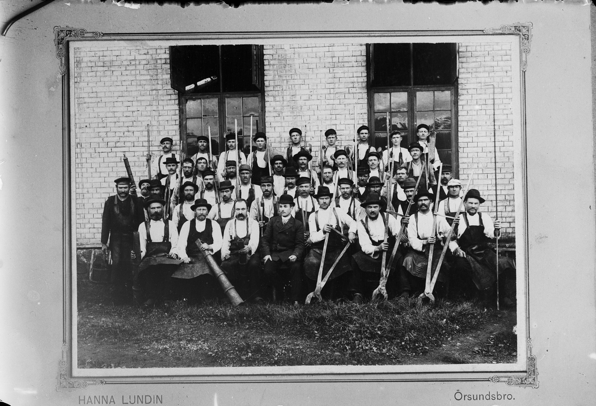 Reprofotografi - smeder med verktyg utanför byggnad, Örsundsbro, Uppland