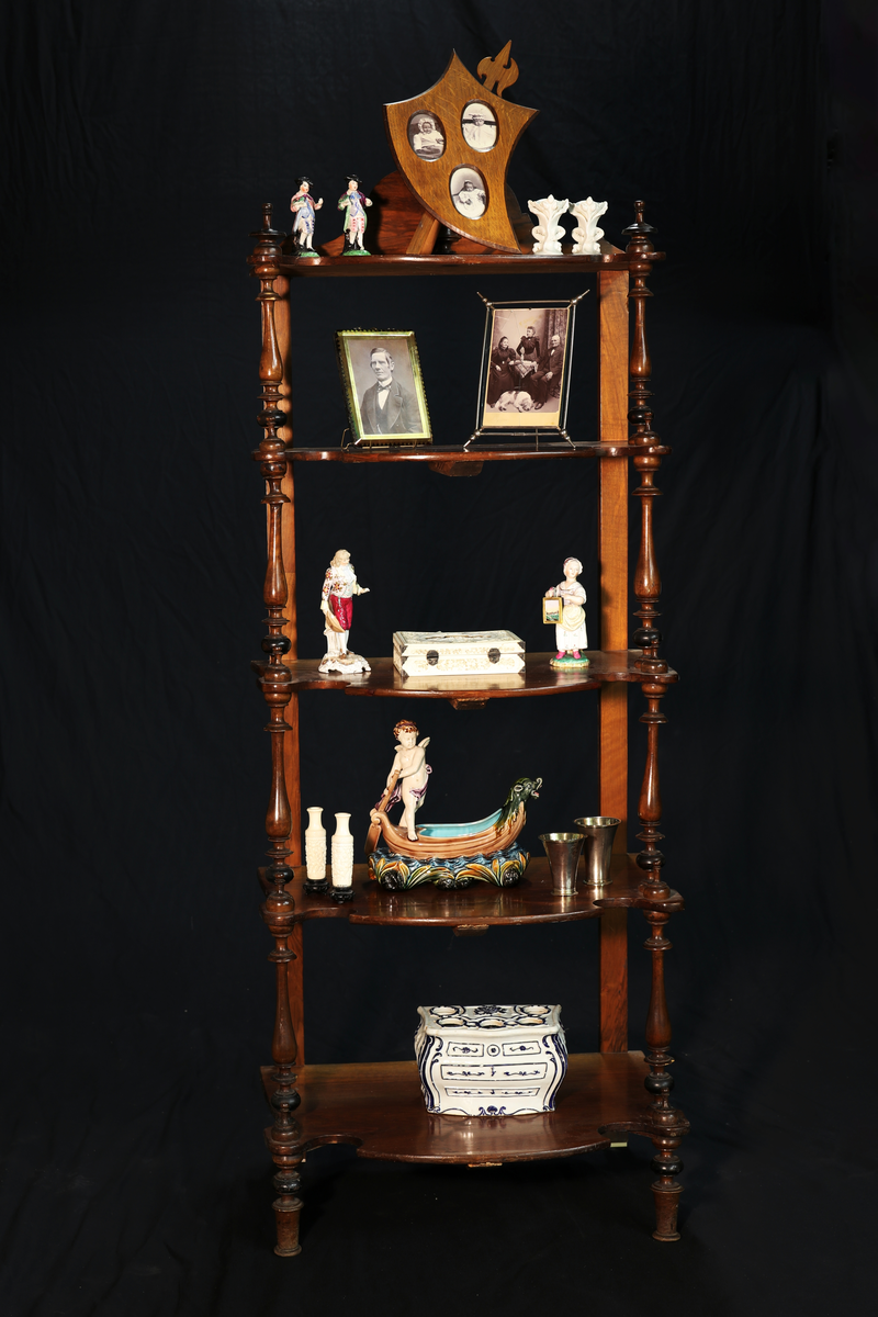 Vänersborgs museum. Prylhylla med föremål ur samlingarna