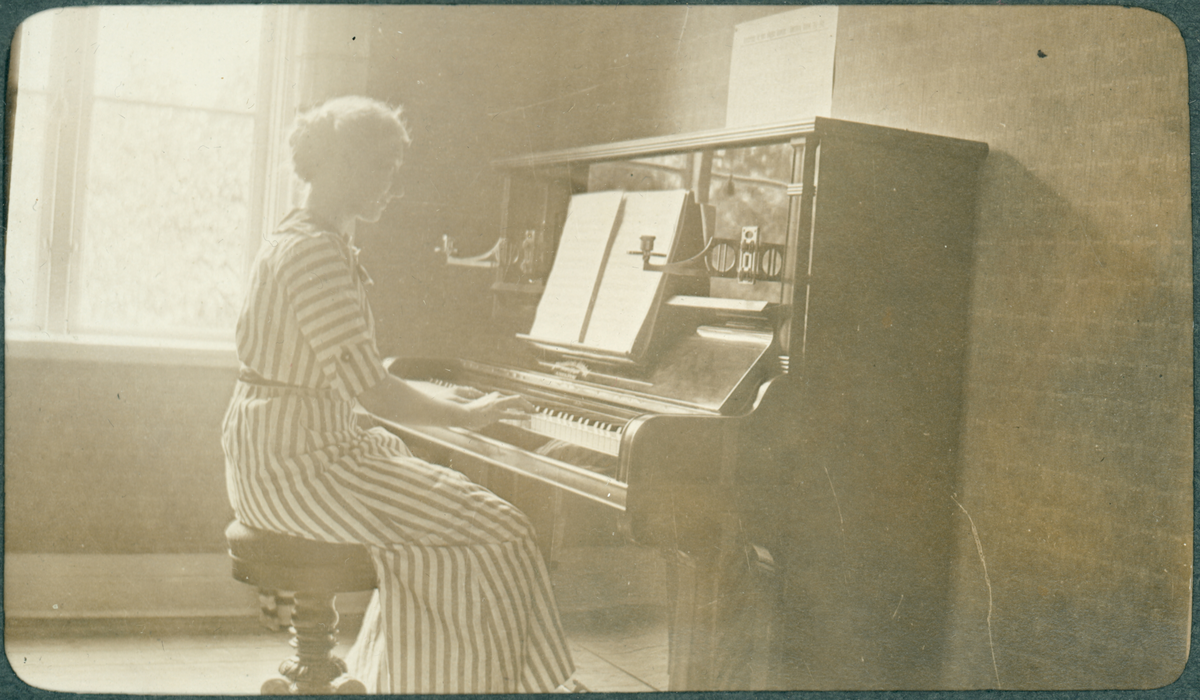 Kvinnan ser ut att vara Ruth Bergius. Kan vara i familjen Bergius bostad på Residensgatan 20