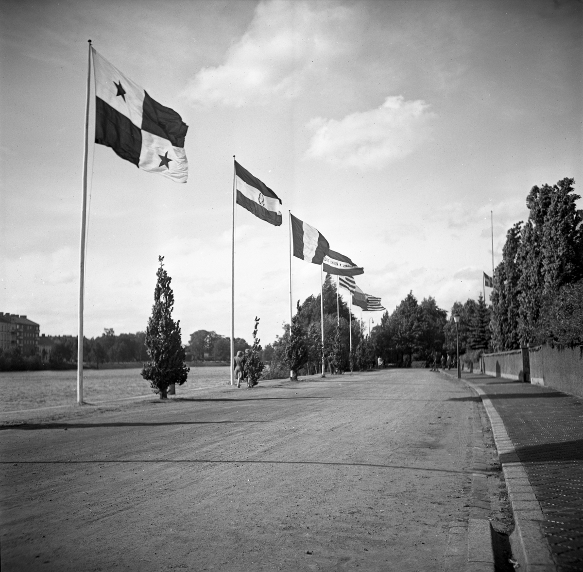 Flaggparad i stråket till museet i samband med öppningen av den Ibero-Amerikanska arkitekturutställningen sommaren 1946.