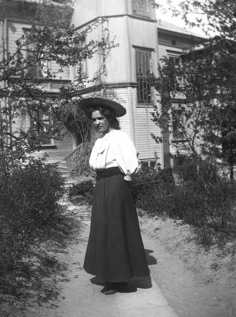 Gerda Forsgren på gårdssidan av dåvarande fastigheten Herrgårdsgatan 5 år 1905.